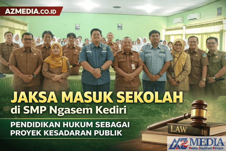 Kediri, AZMEDIA.CO.ID – Di tengah lanskap demokrasi Indonesia yang kerap riuh oleh tarik-menarik kepentingan, program Jaksa Masuk Sekolah (JMS) di SMP Ngasem, Kabupaten Kediri, hadir sebagai intervensi sunyi namun strategis. Ia tidak datang membawa palu pengadilan atau bahasa sanksi, melainkan pengetahuan—sebuah upaya membangun kesadaran hukum sejak dini di ruang yang paling menentukan masa depan republik: sekolah.