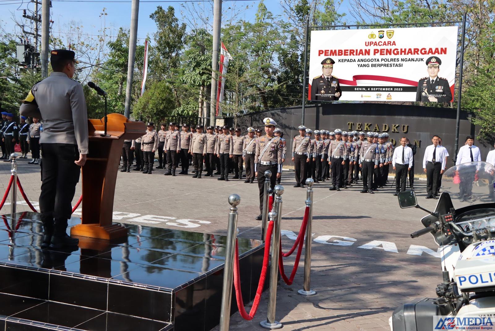 Nganjuk azmedia.co.id Kapolres Nganjuk AKBP Muhammad, S.H., S.I.K., M.Si., memimpin upacara pemberian penghargaan kepada 8 anggota Polres Nganjuk yang dinilai berprestasi. Upacara dilaksanakan di halaman apel Polres Nganjuk, Senin (4/9/2023).