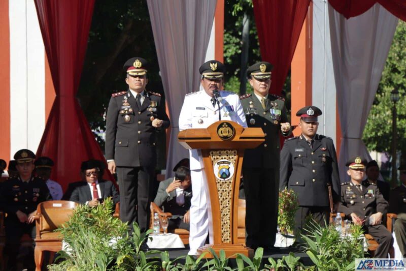 Upacara dengan tema “Polri Presisi Untuk Negeri Pemilu Damai Menuju Indonesia Maju”, digelar di Alun –alun Kabupaten Nganjuk dengan Inspektur upacara Dr. Drs. H. Marhaen Djumadi, S.E., S.H., M.M., MBA.