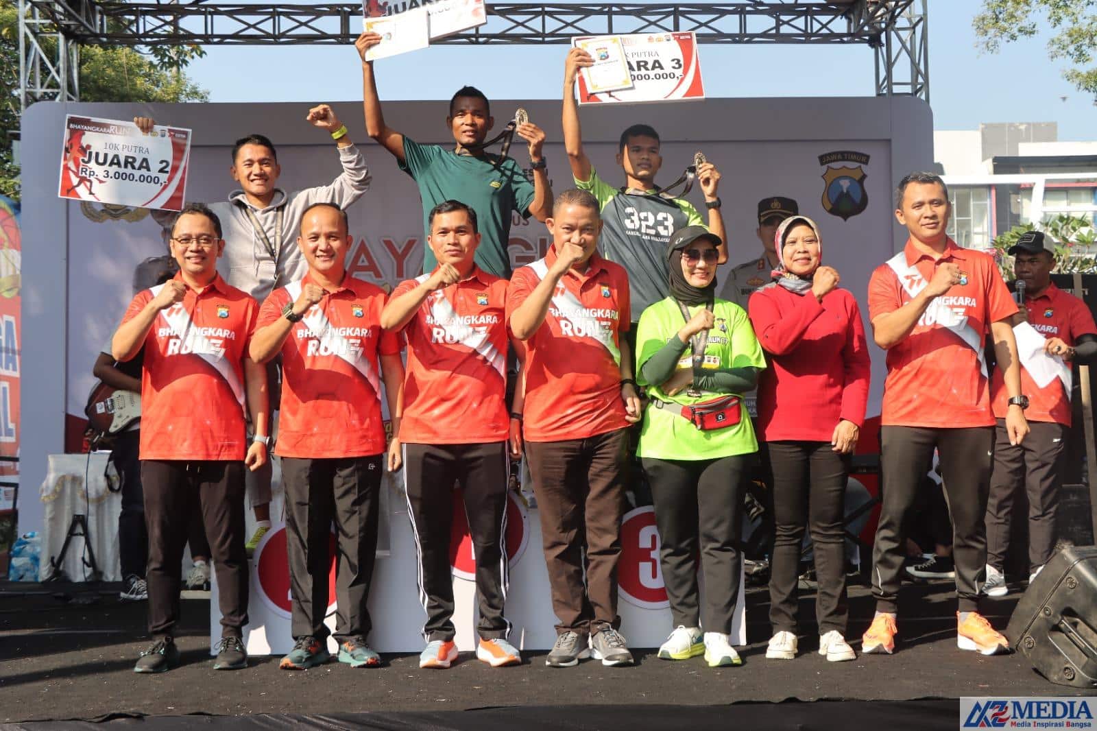 Pemenang Juara 1 Bhayangkara Run 10 KM Putra atas nama Hamdan Sayuti merupakan peserta dari daerah Padang, Sumatera Barat. Sedangkan Pemenang Juara 1 Bhayangkara Run 10 KM Putri atas nama Asniada Aras asal Palu, Sulawesi Tengah, masing-masing mendapatkan uang pembinaan sebesar 5 juta rupiah. (ilyas)